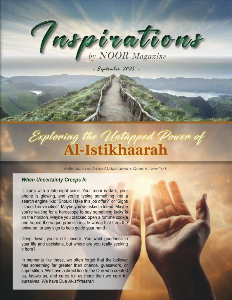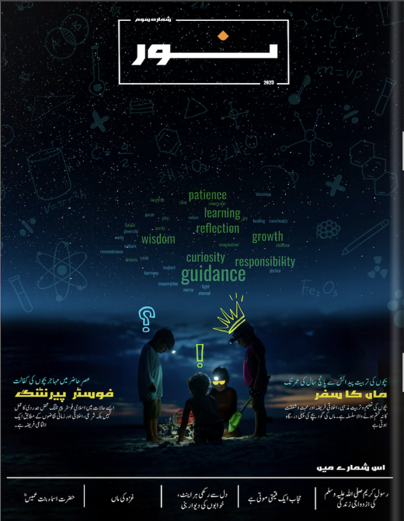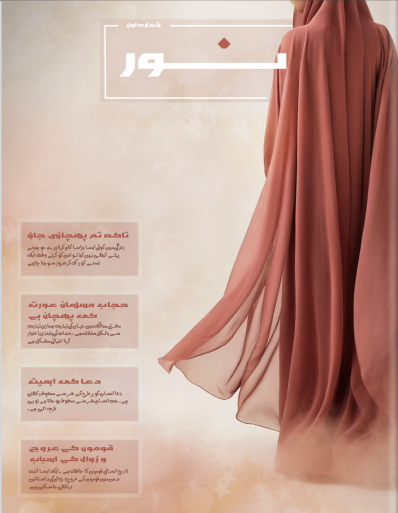 Noor magazine was established by ICNA Sisters with the aim of enabling Muslim women throughout North America to gain more knowledge of our deen . By the grace of Allah (swt), each year, we publish three issues both in English and in Urdu. We cover a variety of themes, focusing on issues relevant to our society and offering solutions for the betterment of humanity at large. An underlying theme of all our issues is the role of Muslims in this Non-Muslim society as a community that enjoins good and prevents evil.